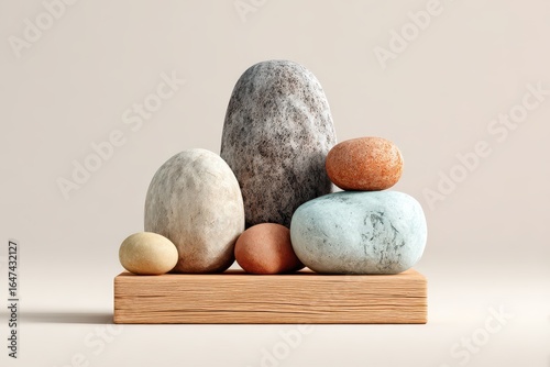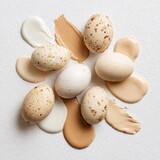 Speckled beige eggs arranged on paint swatches in a creative composition