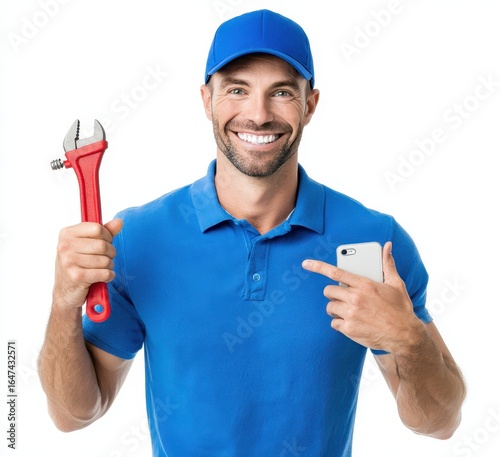 Smiling plumber in blue uniform holding a red adjustable wrench