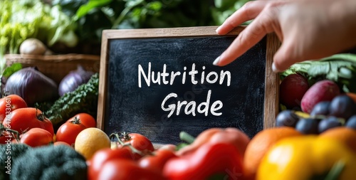 Chalkboard with nutrition grade surrounded by fresh vegetables on display