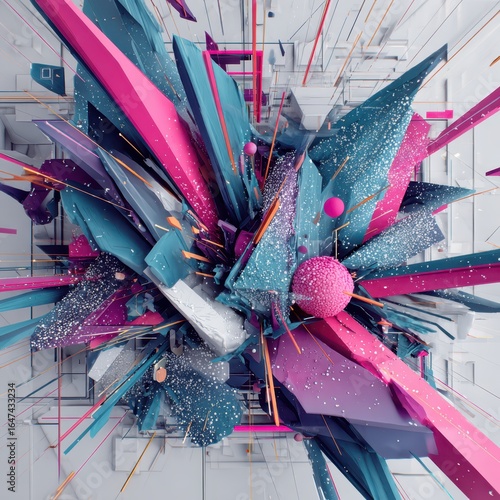 Abstract geometric explosion with vibrant colors and dynamic shapes