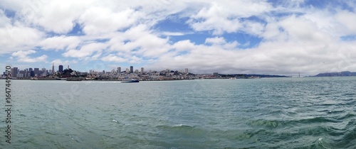 Panoramic view of bridge and cityscape over calm water in bright daylight