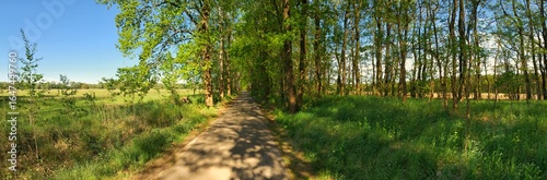 Scenic forest pathway panorama with lush greenery and clear blue sky