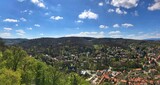 Panoramic view of a picturesque rural town with trees and hills under clear skies