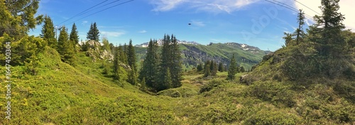 Beautiful green mountain landscape panorama with trees and a bright blue sky
