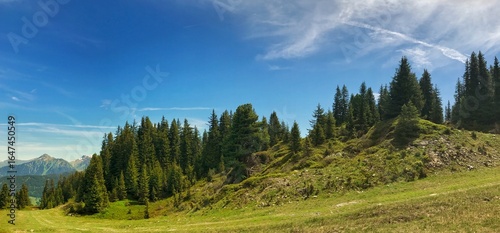 Beautiful green mountain landscape panorama with trees and a bright blue sky