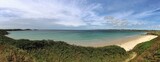 Panoramic view of a sandy coastline with waves under a cloudy sky