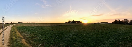 Wide countryside panorama with dirt road and sunny fields in bright weather