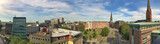 Panoramic cityscape view with buildings, spires, and blue sky under calm conditions