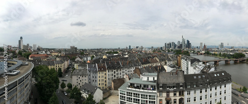Panoramic cityscape view with modern skyline and river under cloudy sky