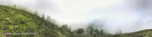 Panoramic view of misty mountainous landscape with lush greenery and cloudy skies