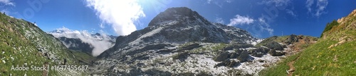 Panoramic mountain view of rocky alpine scenery under bright blue sky