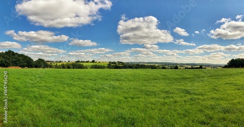 Panoramic view of a green field with a blue sky and fluffy clouds