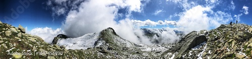 Panoramic alpine mountain view with snow, clouds, and blue sky