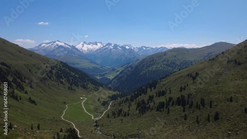 Breathtaking Drone View of Lush Green Valley with Snow-Capped Austrian Alps in Summer Sunshine