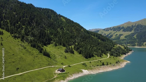 Aerial View of Serene Koenigsleiten Lake and Lush Green Mountains in the Austrian Alps.