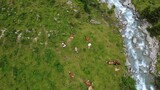 Aerial View of Cows Grazing by a Mountain River in the Austrian Alps During Summer