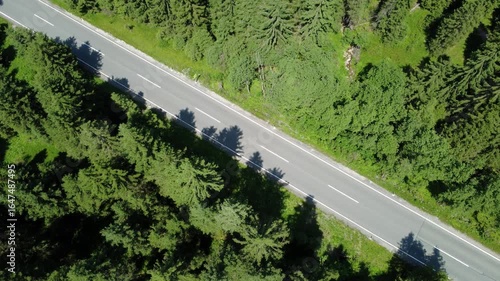 Scenic Aerial View of a Car on a Winding Forest Road in Lush Green Nature.