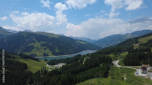 Stunning Aerial View of an Alpine Valley with a Serene Lake in the Austrian Alps