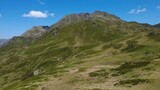 Drone Pan View of Majestic Austrian Alps in Summer with Lush Green Slopes and Clear Blue Sky.