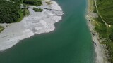 Aerial View of a Pristine Alpine Lake Nestled in the Scenic Austrian Alps During Summer.