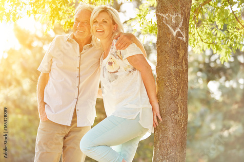 Zwei Paare umarmen sich im Garten vom Seniorenheim