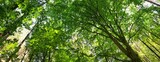 Panoramic view of a vibrant forest canopy with lush green leaves