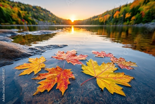 Scenic autumn lake with colorful trees reflecting in calm waters