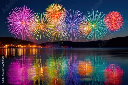 Colorful fireworks illuminating a calm lake at night with radiant reflections