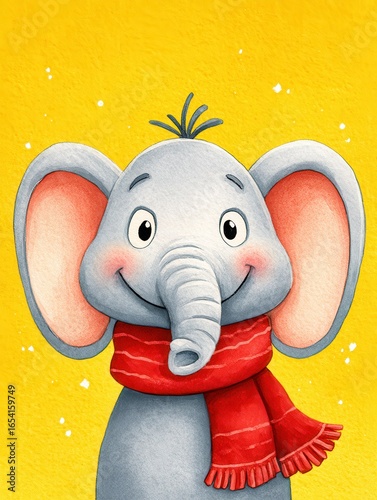 Adorable cartoon elephant wearing red scarf on a bright yellow background