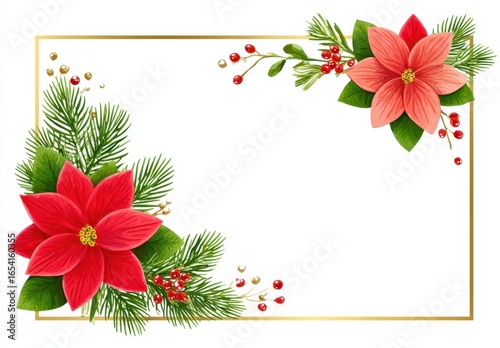 Festive Christmas frame with poinsettias, pine branches, and decorative accents