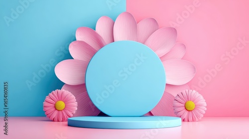 Pastel display podium with pink flowers on a vibrant two-tone background