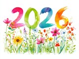 Colorful watercolor year 2026 surrounded by vibrant wildflowers and greenery