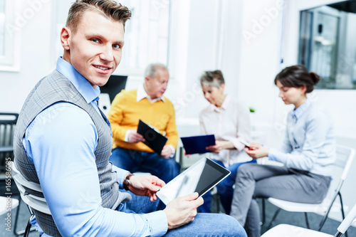 Handschlag vor vielen bunten Portraits einer Gesellschaft als Konzept für Miteinander