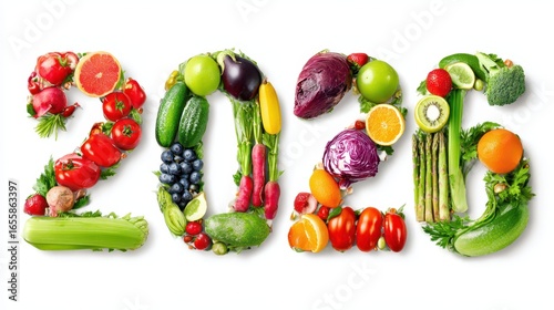 Fruits and vegetables arranged in the shape of the year 2026 on white