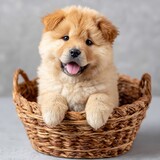 Adorable fluffy chow chow puppy sitting in a wicker basket