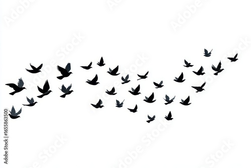 Flock of birds flying in formation against a bright clear white sky