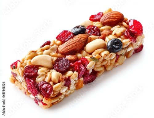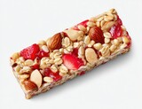 Granola bar with nuts and fruits on a clean white background