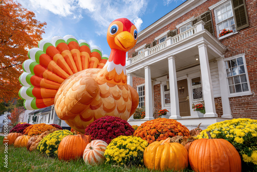 Festive home front yard with inflatable turkey and Autumn decorations under a sunny sky