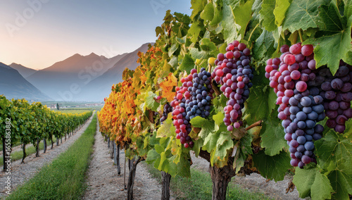 Vibrant vineyard at sunset with ripe red and purple grapes hanging on vines
