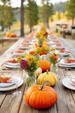 Long rustic table adorned with pumpkins and flowers in an autumn setting