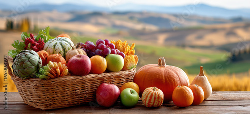 Autumn harvest display of fruits, vegetables, and wheat in natural landscape