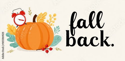 Autumn-themed illustration featuring a pumpkin and a clock with fall foliage
