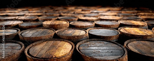Close-up of wooden whiskey barrels arranged in a dark aging cellar
