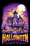 Haunted house surrounded by jack-o'-lanterns with bats and a full moon