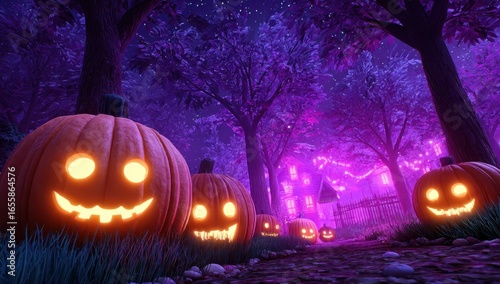Jack-o-lantern trail leading to a haunted house under moonlight