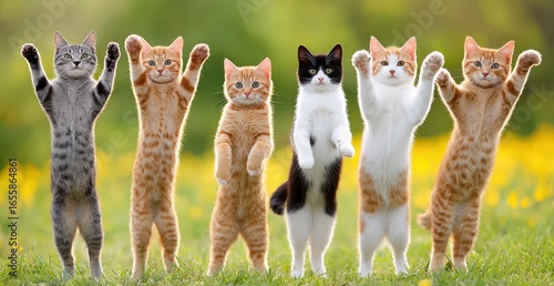Adorable kitten chasing butterfly in sunny meadow full of wildflowers