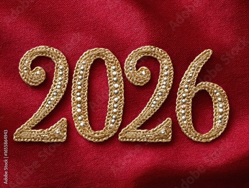 Golden embroidered lettering of year 2026 on deep red fabric background