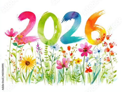 Colorful watercolor year 2026 surrounded by vibrant wildflowers and greenery