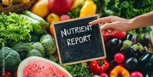 Chalkboard with nutrient report surrounded by fresh fruits and vegetables