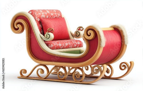 Ornate wooden sleigh with detailed carvings and vibrant red upholstery